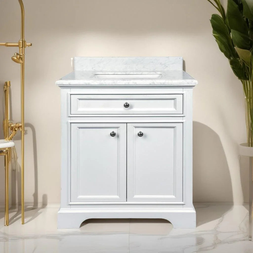 30″ White Wall Mount Bathroom Vanity with Black Engineered Quartz Countertop