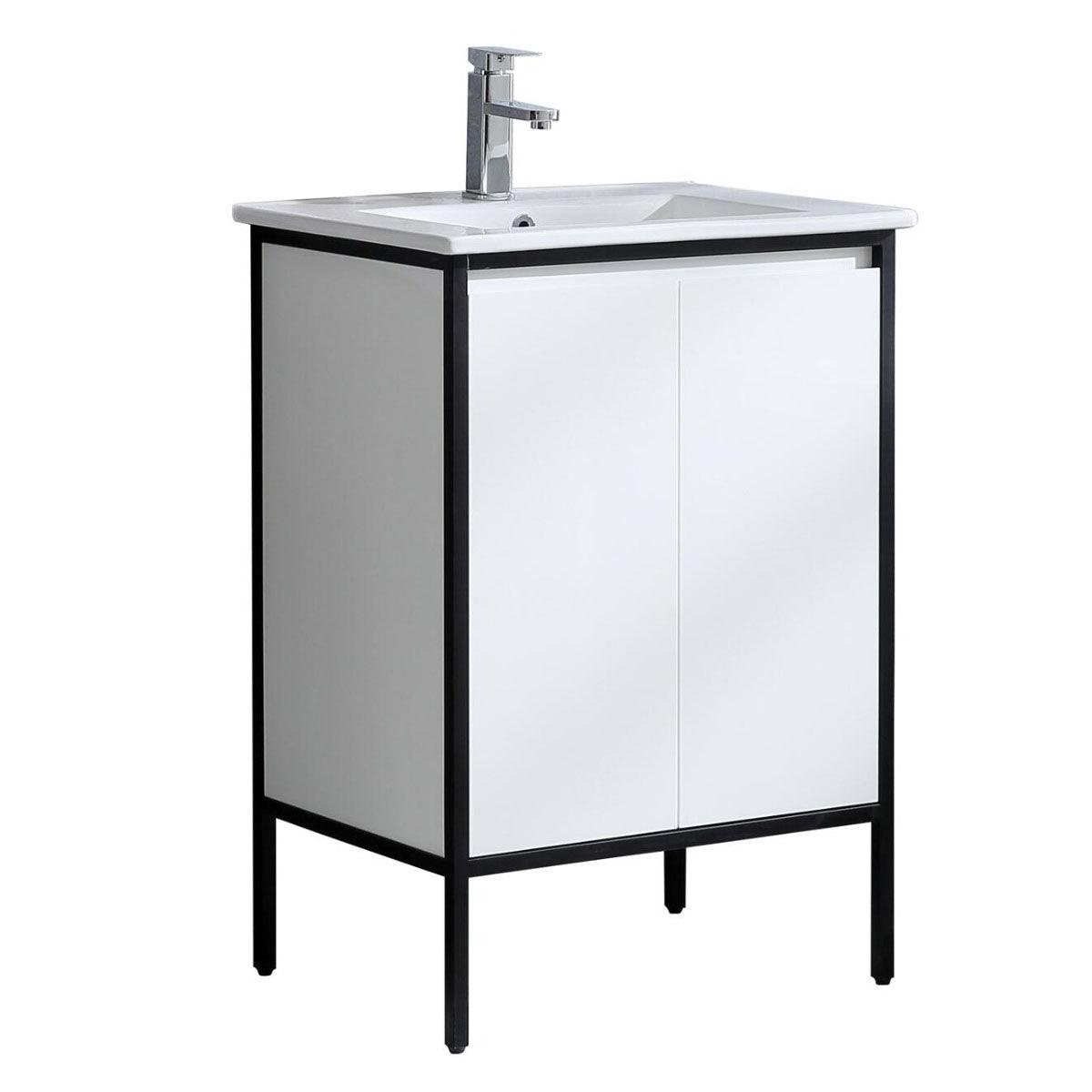 Step into a realm of elegance with the Aciera 24″ freestanding bathroom vanity, where design meets harmonious functionality. This vanity transforms your bathroom rituals with its sleek black matte metal structure, set on adjustable feet for perfect alignment. The moisture-resistant PBC cabinet, featuring two soft-closing doors, offers convenient storage. Topped with a high-gloss white ceramic countertop, it provides a smooth, easy-to-clean surface. Elevate your space with this piece that reflects your appreciation for quality and style.