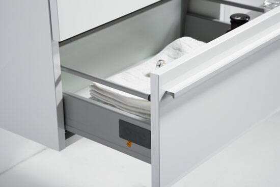 • Two full-extension, soft-closing 13.5″ (343 mm) deep drawers providing ample storage with aluminum handles