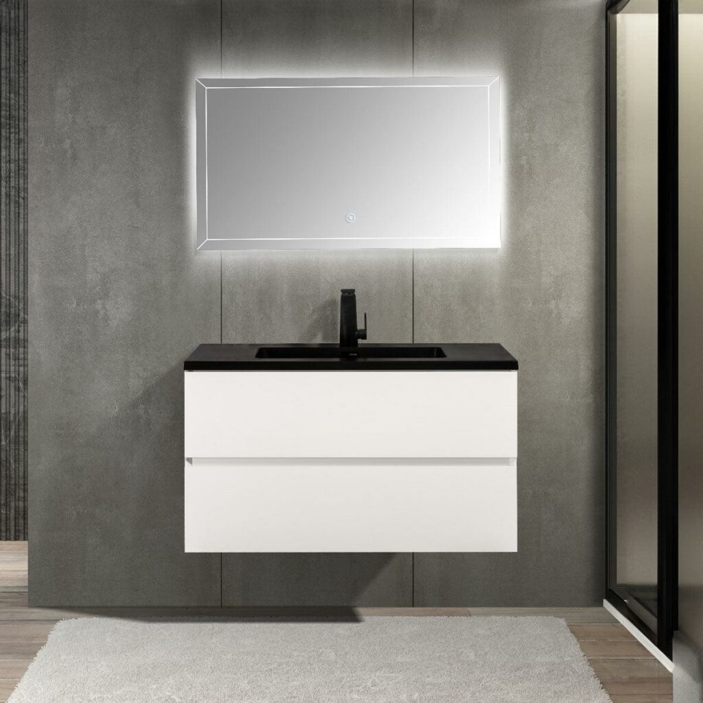 36″ White Wall Mount Bathroom Vanity with Black Engineered Quartz Countertop