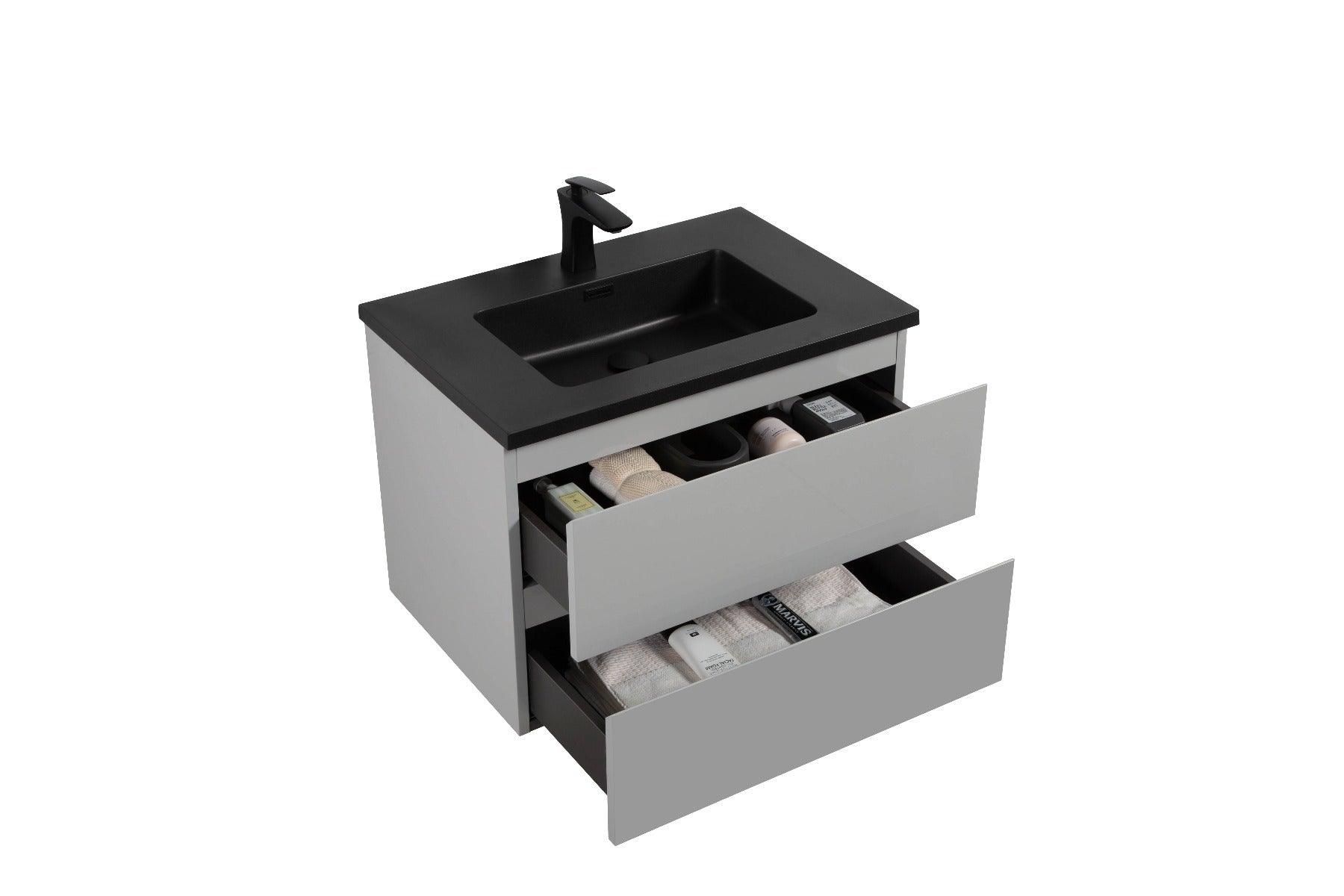 28″ Grey Wall Mount Single Sink Bathroom Vanity with Black Engineered Quartz Countertop