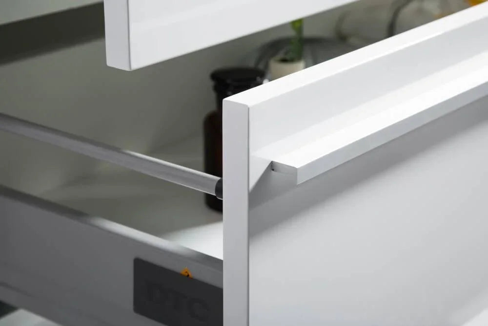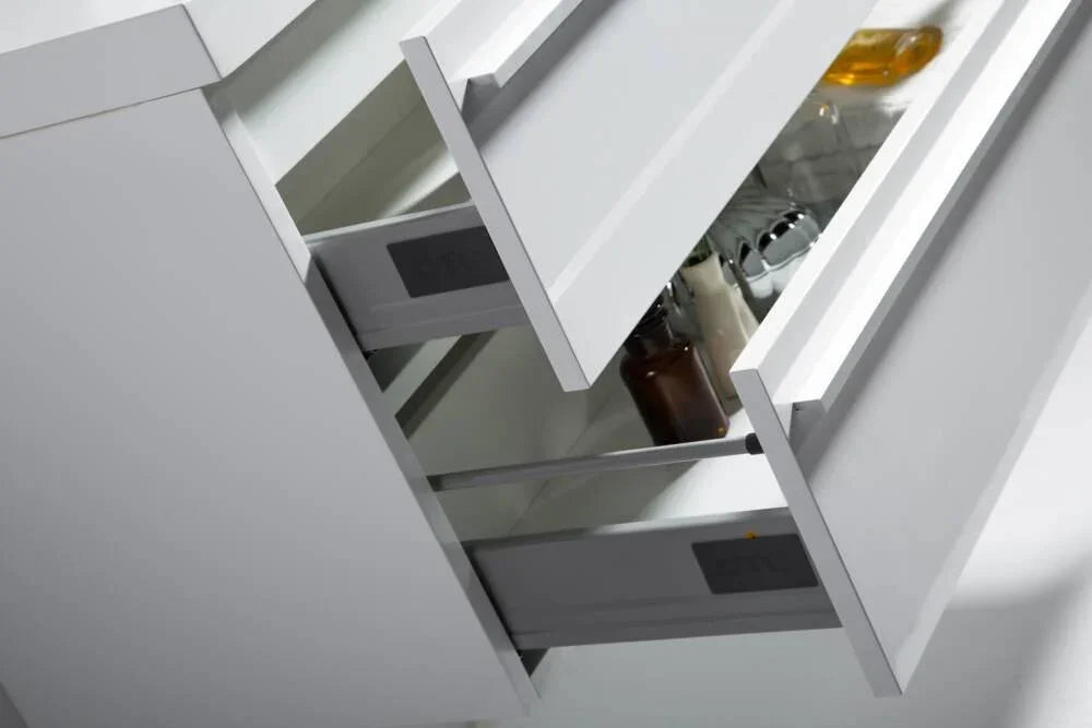 With clean lines and a sleek aesthetic, the Sofia 36″ wall-mounted bathroom vanity fits seamlessly into any modern bathroom. Featuring a moisture-resistant cabinet frame crafted from PBC (particle board core) and drawer fronts made of moisture-resistant MDF, it is completed by a polymarble countertop with a white high-gloss finish and a rectangular sink. The two German-engineered soft-closing drawers with aluminum handles in a chrome finish are designed to accommodate plumbing while providing ample storage space under the sink. The Sofia vanity countertop is more durable than traditional ceramic or porcelain and requires minimal maintenance.