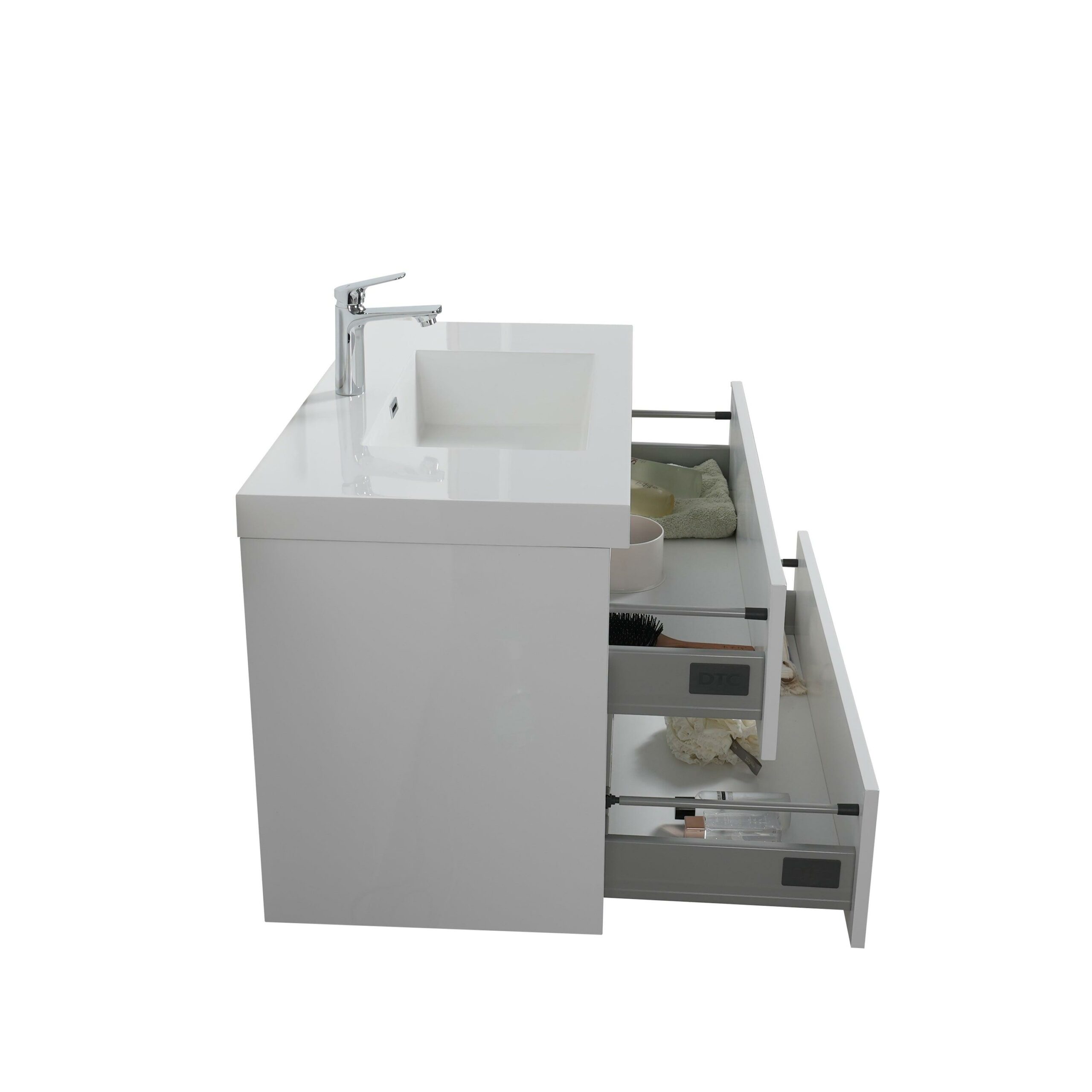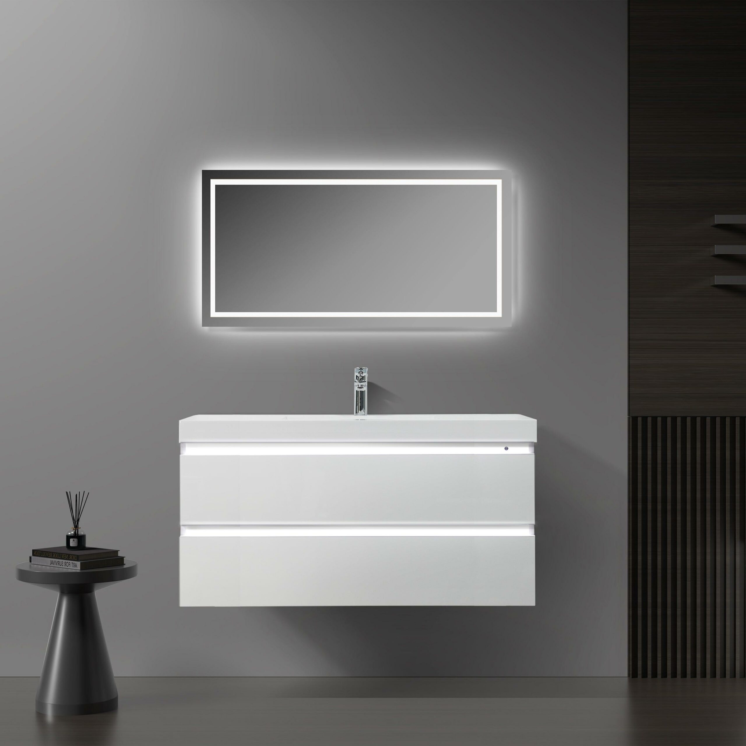 42″ Glossy White Wall Mount Light-Up Bathroom Vanity with White Polymarble Countertop