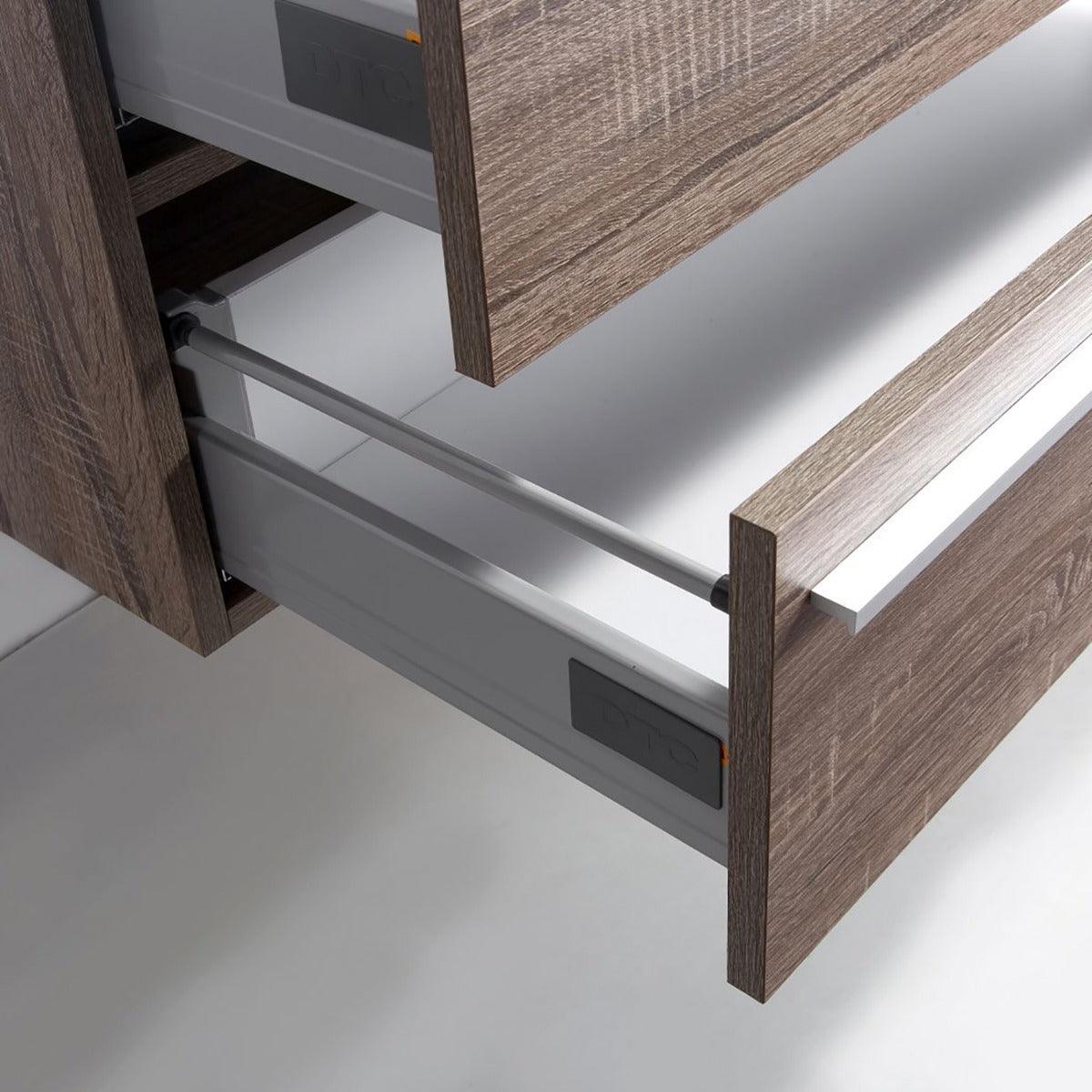 • Soft Oak floating vanity with moisture-resistant cabinet frame crafted from PBC (particle board core) and moisture-resistant MDF door faces, ensuring durability in wet conditions