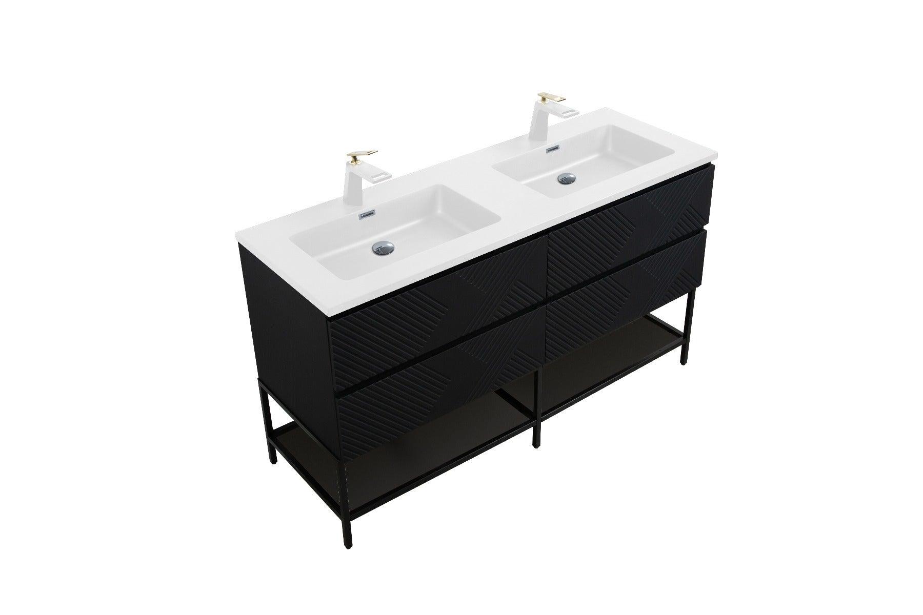 60″ Black Wall Mount Bathroom Vanity with White Polymarble Countertop & Open Shelf