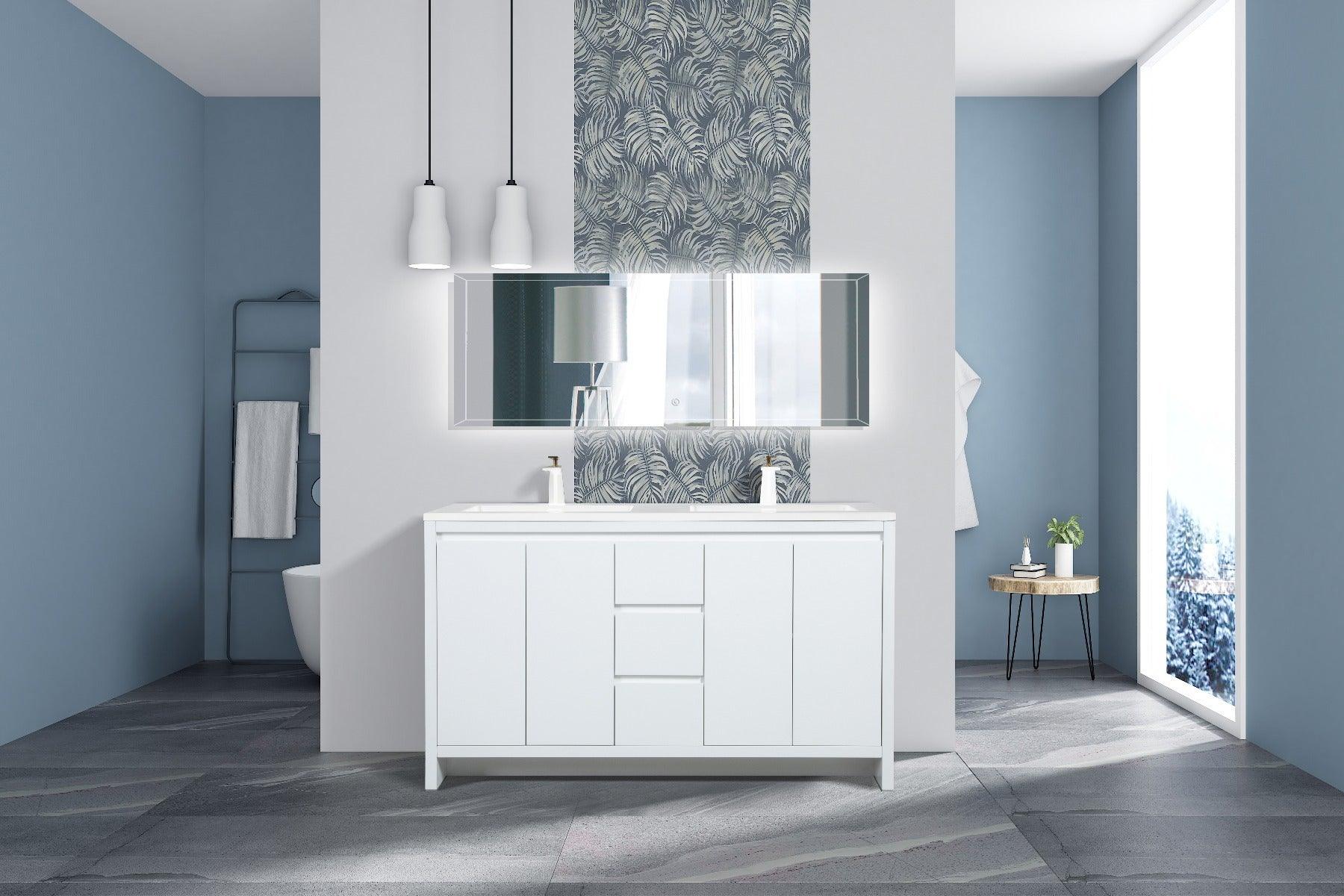 60″ Glossy White Freestanding Double Sink Bathroom Vanity with White Polymarble Countertop