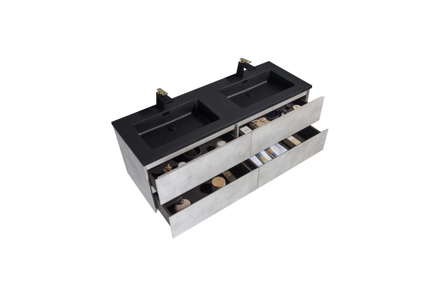 60″ Grey Wall Mount Double Sink Bathroom Vanity with Black Engineered Quartz Countertop