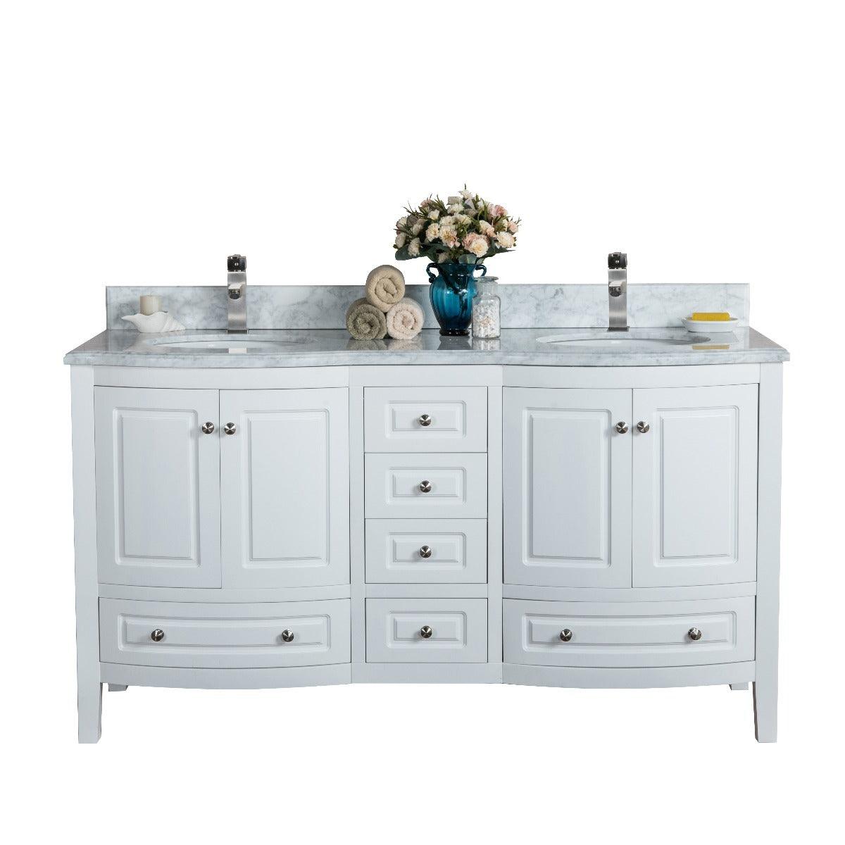 60″ White Freestanding Double Sink Bathroom Vanity with Carrera Marble Countertop Porto