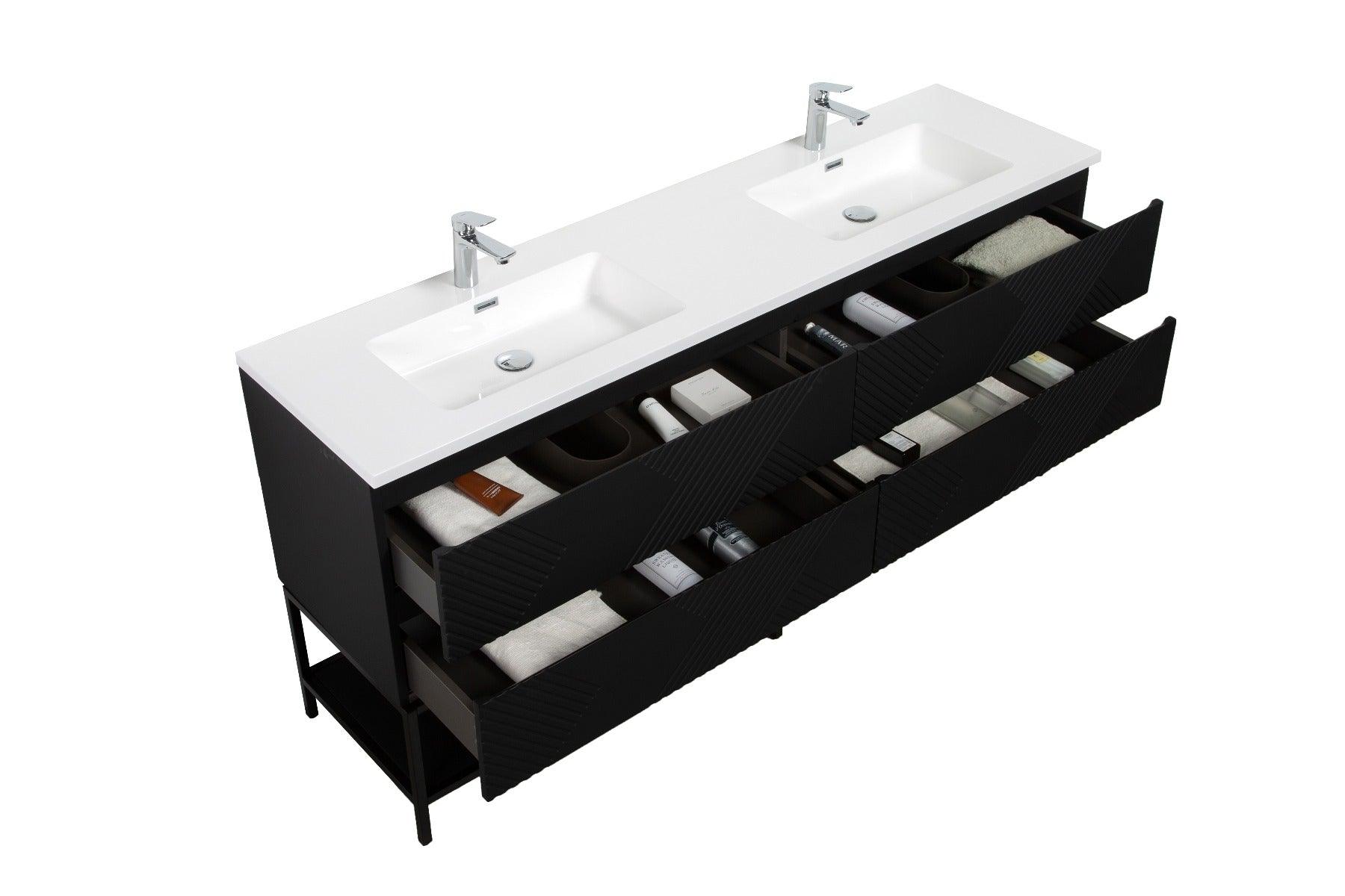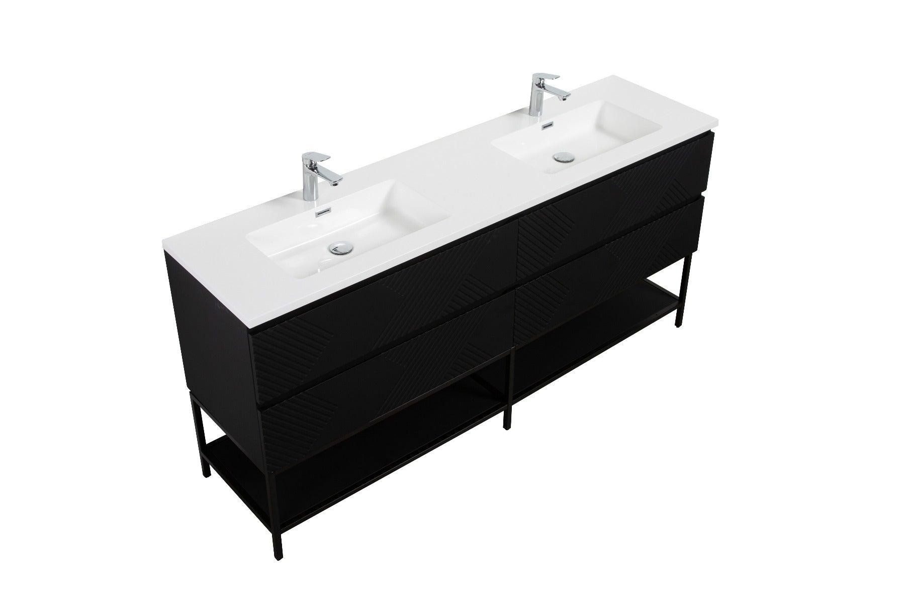 72″ Black Wall Mount Double Sink Bathroom Vanity with White Polymarble Countertop & Open Shelf