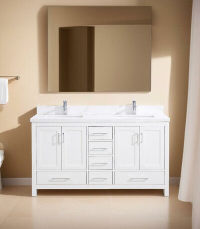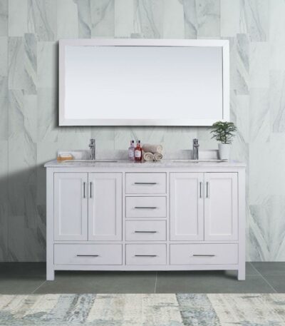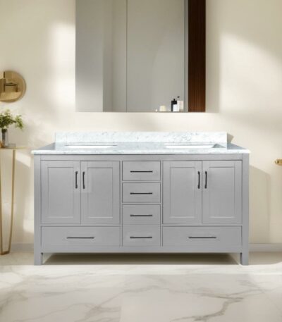 60″ Light Grey Freestanding Double Sink Bathroom Vanity with Carrera Marble Countertop
