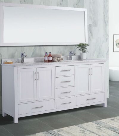 72″ White Freestanding Double Sink Bathroom Vanity with Carrera Marble Countertop