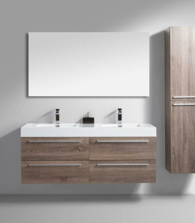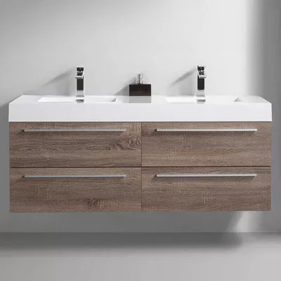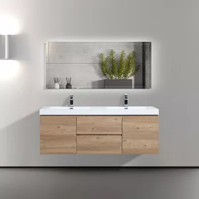 60″ Soft Oak Wall Mount Double Sink Bathroom Vanity with White Polymarble Countertop Sofia