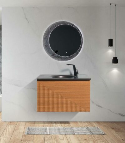 24″ Rough Oak Wall Mount Bathroom Vanity with Black Engineered Quartz Countertop Edge
