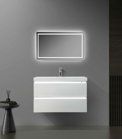 36″ Glossy White Wall Mount Light-Up Bathroom Vanity with White Polymarble Countertop