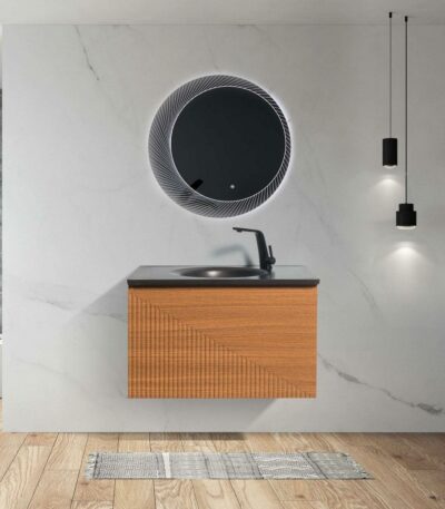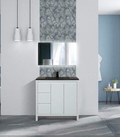 36″ Grey Wall Mount Bathroom Vanity with Black Engineered Quartz Countertop