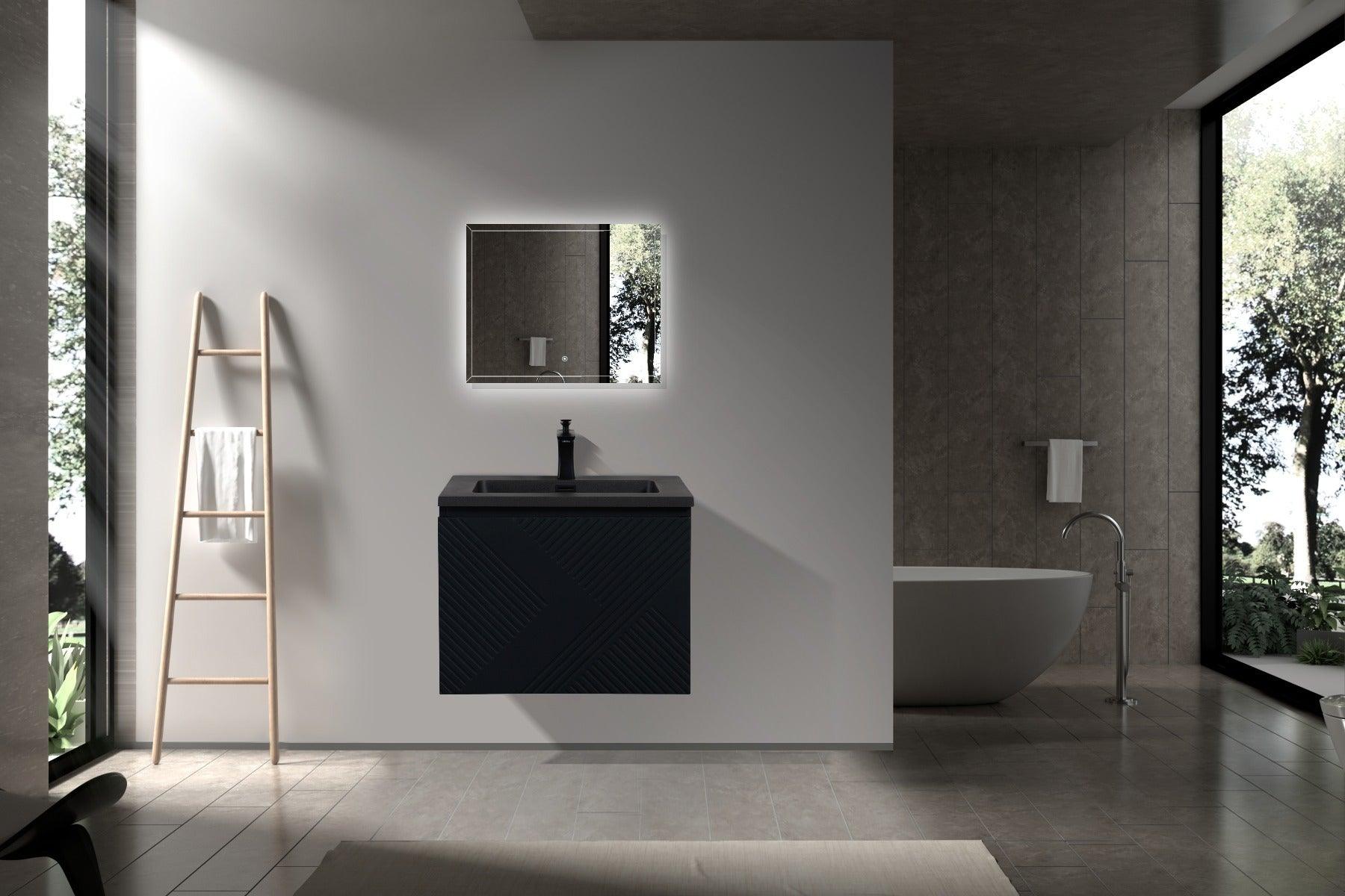 • Black floating vanity with moisture-resistant cabinet frame crafted from MDF ensuring durability in wet conditions