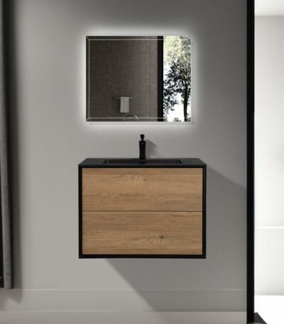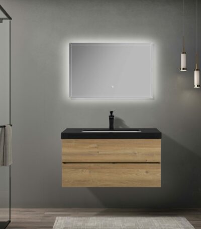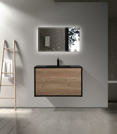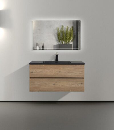 40″ Rough Oak Wall Mount Bathroom Vanity with Black Polymarble Countertop Edge