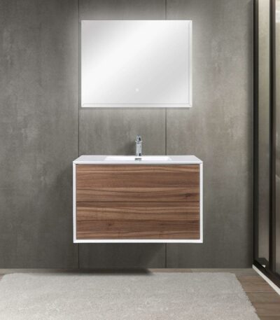 36″ Walnut Wall Mount Bathroom Vanity with White Solid surface Countertop