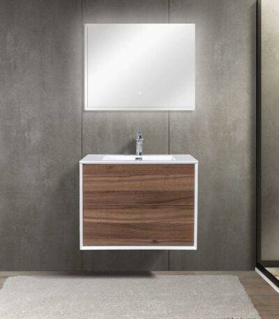 30″ Walnut Wall Mount Bathroom Vanity with White Solid surface Countertop