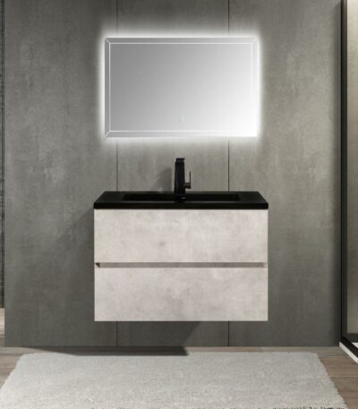 30″ Grey Wall Mount Bathroom Vanity with Black Engineered Quartz Countertop